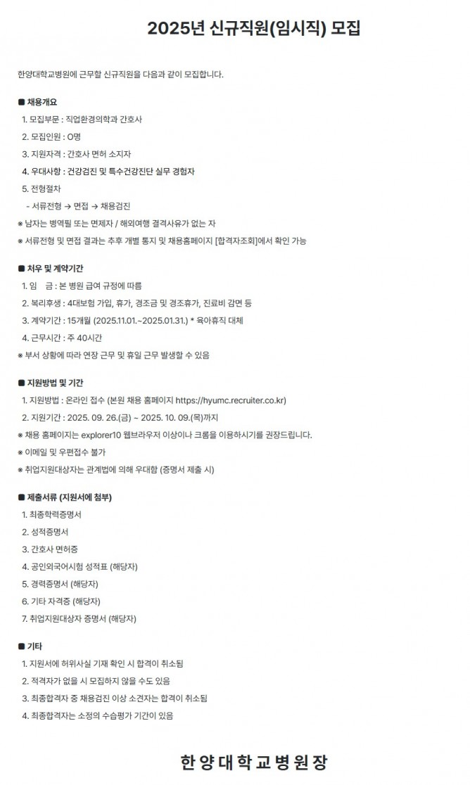 25.09.26 ~ 25.10.09직업환경의학과 간호사 (임시직) 모집