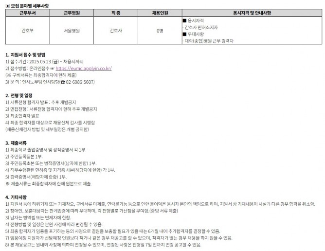 25.10.13 ~ 25.10.19이대서울병원 간호부 계약직 간호사(외래) 공개채용 공고