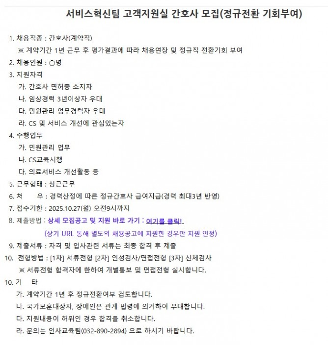 25.10.20 ~ 25.10.27서비스혁신팀 고객지원실 간호사 모집(정규전환 기회부여)