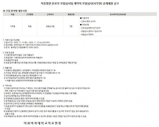 25.11.13 ~ 25.11.19진료부 보험심사팀 계약직 보험심사 사무원(간호사) 공개채용 공고