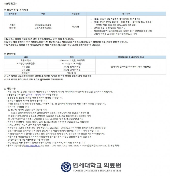 25.11.26 ~ 25.12.052026년도 세브란스병원(신촌) 신규간호사 모집