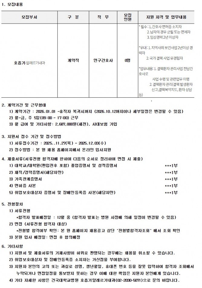 25.11.27 ~ 25.12.03호흡기알레르기내과 결핵전담 연구간호사 채용