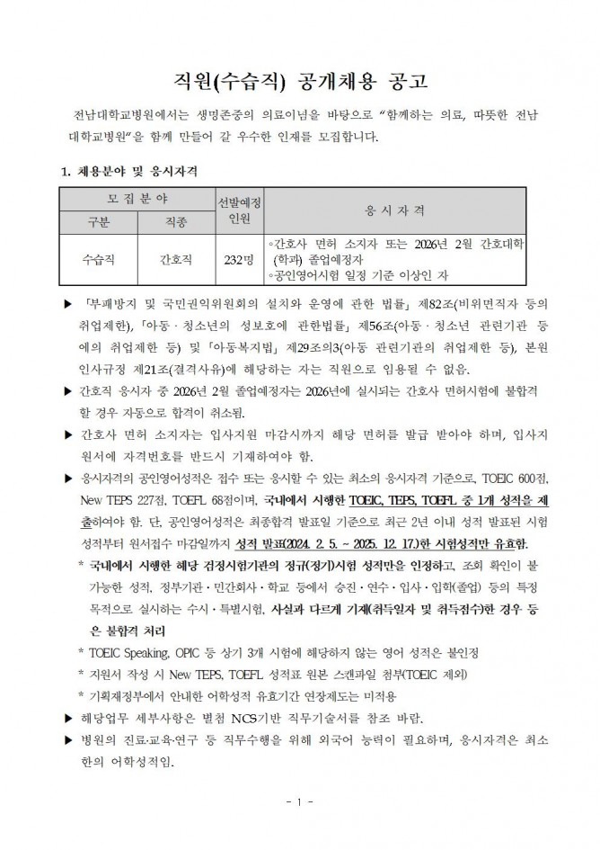 25.12.03 ~ 25.12.172025년 전남대학교병원 직원(간호직) 공개채용 공고