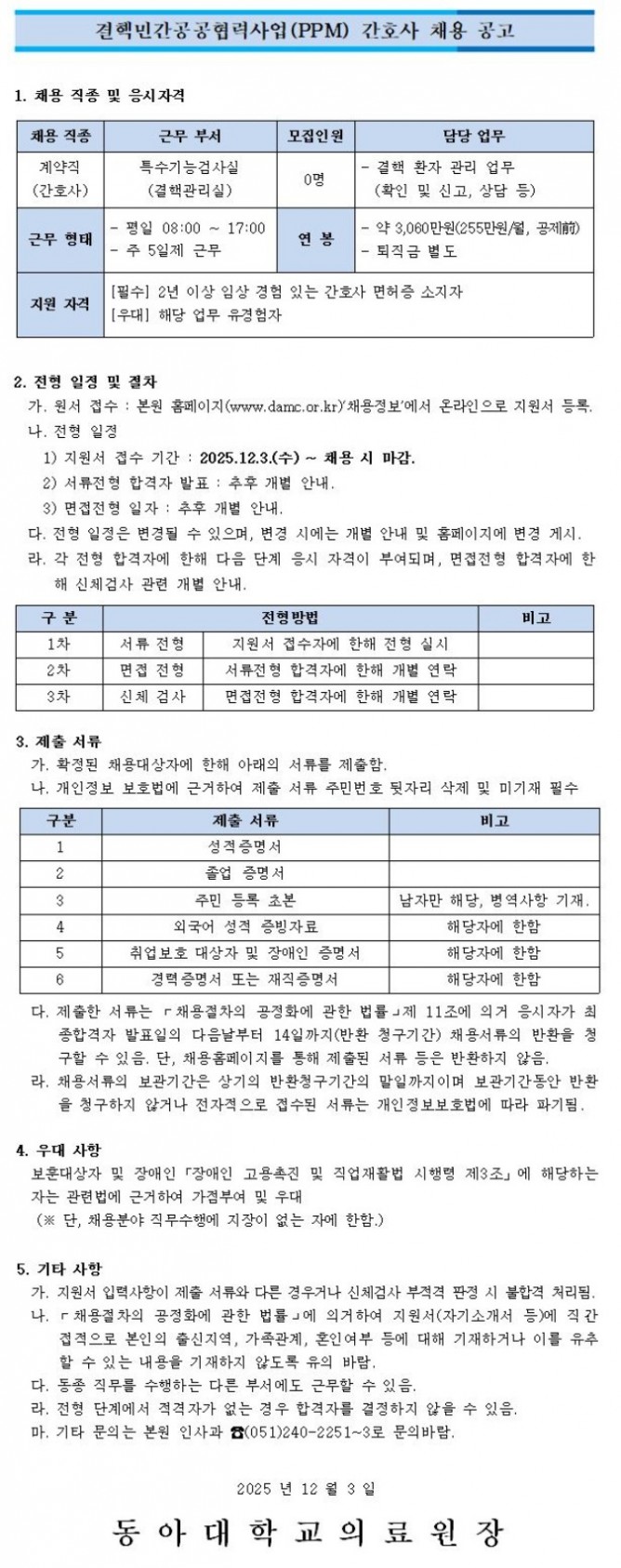 25.12.03 ~ 25.12.31특수기능검사실(결핵관리실) 임시직 간호사 채용 공고
