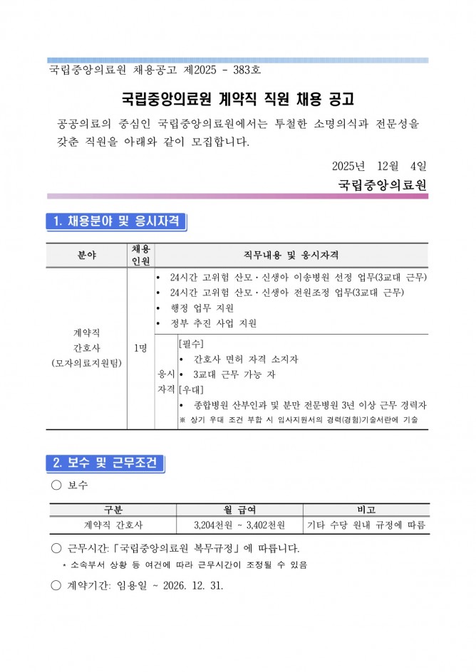 25.12.04 ~ 25.12.19계약직 간호사(모자의료지원팀) 채용공고