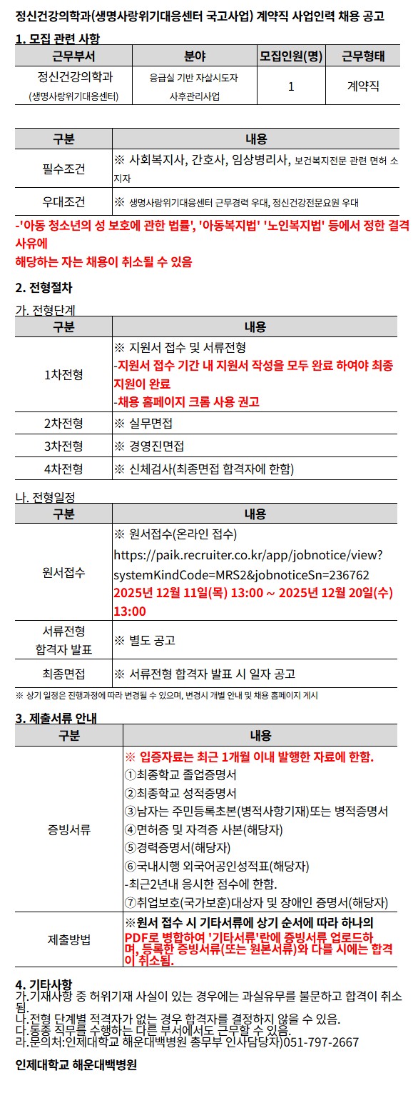 25.12.11 ~ 25.12.20정신건강의학과 계약직 간호사 등 사업인력 채용 공고