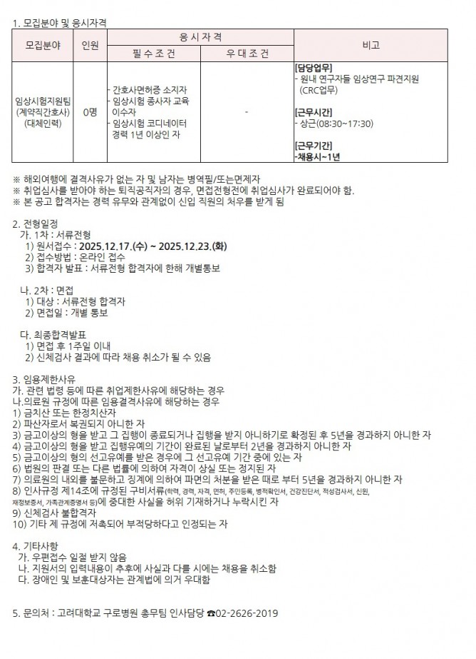 25.12.17 ~ 25.12.23임상시험지원팀 계약직간호사 모집(대체인력)
