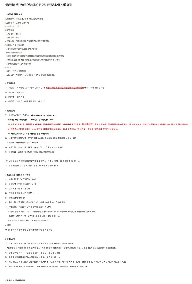 25.12.22 ~ 26.01.04간호국(신경외과) 정규직 전담간호사(경력) 모집