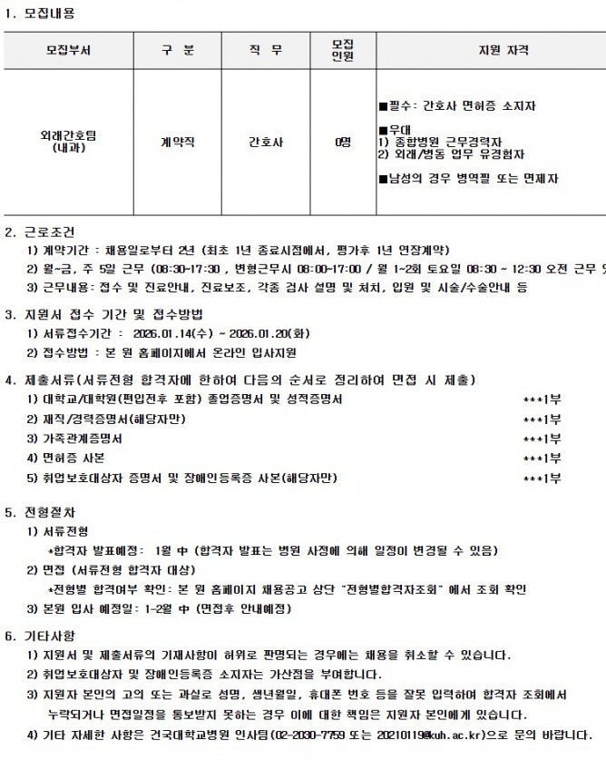 26.01.14 ~ 26.01.20[계약직] 외래간호팀(내과) 간호사 채용
