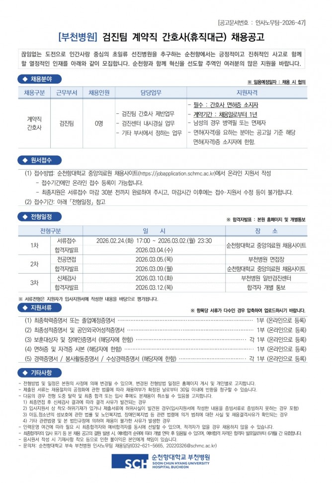26.02.24 ~ 26.03.02검진팀 계약직 간호사(휴직대근) 채용공고