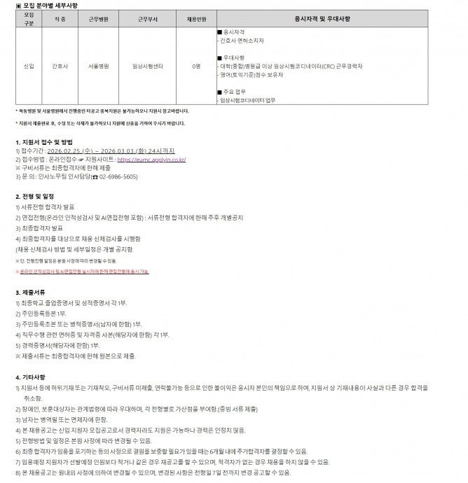 26.02.25 ~ 26.03.03서울병원 임상시험센터 정규직 간호사(신입) 공개채용 공고
