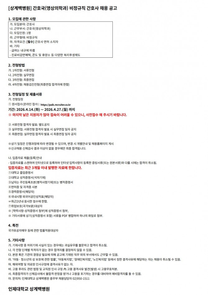 26.04.14 ~ 26.04.27간호국(영상의학과) 비정규직 간호사 채용 공고
