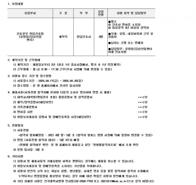 26.04.17 ~ 26.04.26[계약직] 전담간호팀(유방암센터) 전담간호사 채용