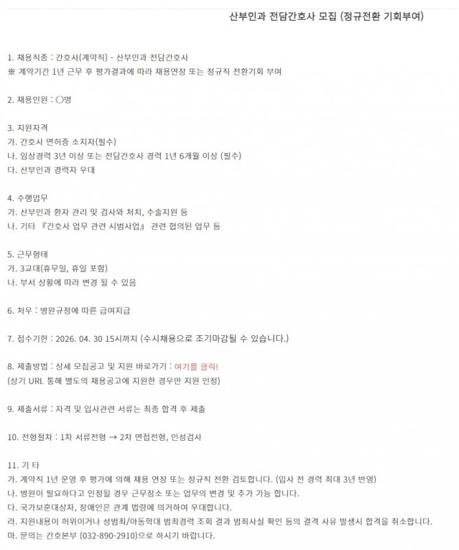 26.04.21 ~ 26.04.30산부인과 전담간호사 모집 (정규전환 기회부여)