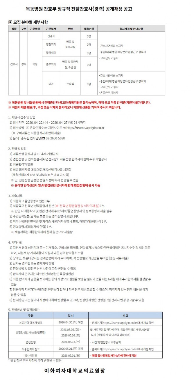 26.04.22 ~ 26.04.27목동병원 간호부 정규직 전담간호사(경력) 공개채용 공고