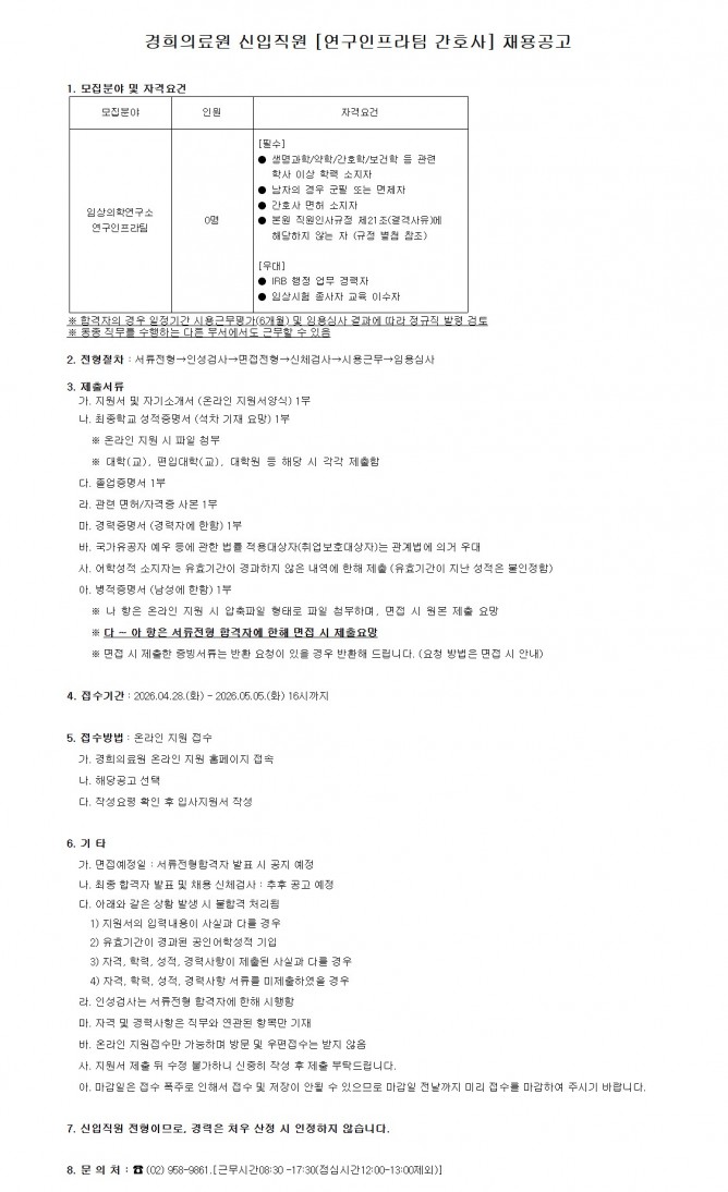 26.04.28 ~ 26.05.05정규직 신입직원 [연구인프라팀 간호사] 공개채용 모집
